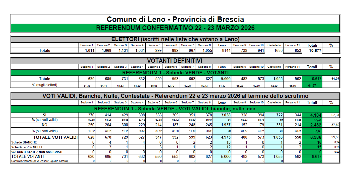 Per visionare i risultati elettorali del referendum del 22 e 23 marzo 2026 relativi al Comune di Leno, cliccare qui: Risultati Referendum 22-23 marzo 2026